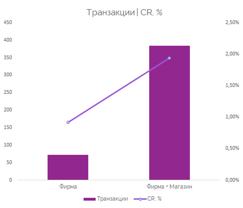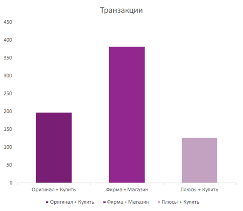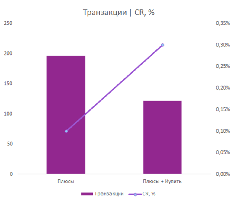 Моноприставка «плюсы» принесла больше транзакций, чем микс-приставка «плюсы + купить», однако у последней коэффициент CR почти в два раза выше.