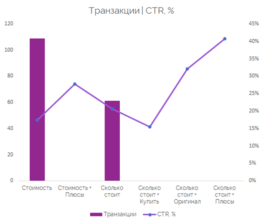 Интересно посмотреть на две схожие по смыслу приставки: «стоимость» и «сколько стоит». Они отрабатывают по-разному: «стоимость» приносит почти в два раза больше транзакций при примерно одинаковом уровне кликабельности объявлений (около 20%).