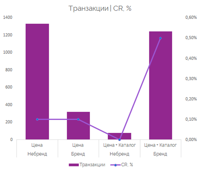А сложные приставки со словами «сколько стоит»вообще не приносят транзакций несмотря на высокий CTR. Вероятно, пользователи указывают эти слова в запросе только для поиска информации, но не в момент принятия решения о покупке.