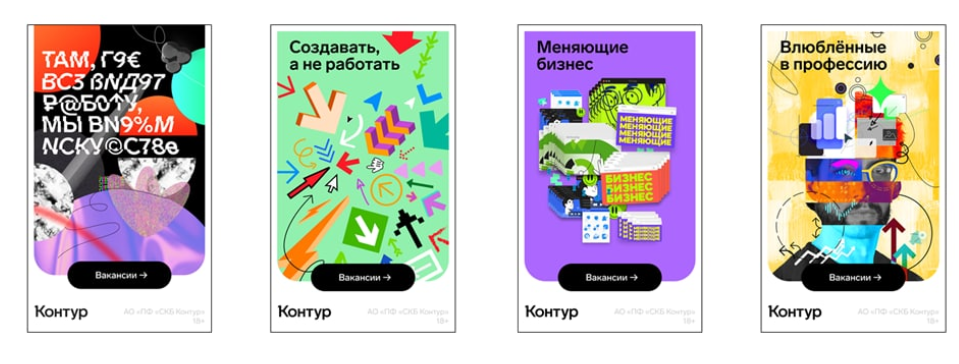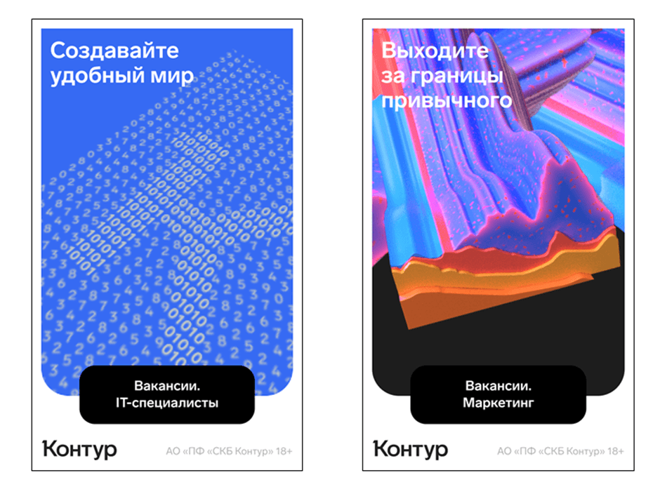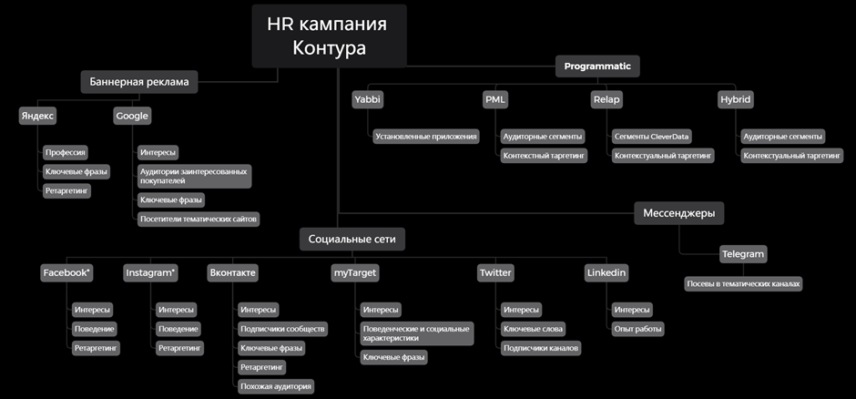 На первом этапе знакомили сегменты с Контуром: рассказывали, как клиент относится к работе и к сотрудникам. Так как тут доносили общие ценности и атрибуты HR-бренда, важно было охватить максимальное количество людей. Выбрали инструменты с большой емкостью ЦА и оптимальным CPM: Google, Яндекс, PML, Вконтакте.