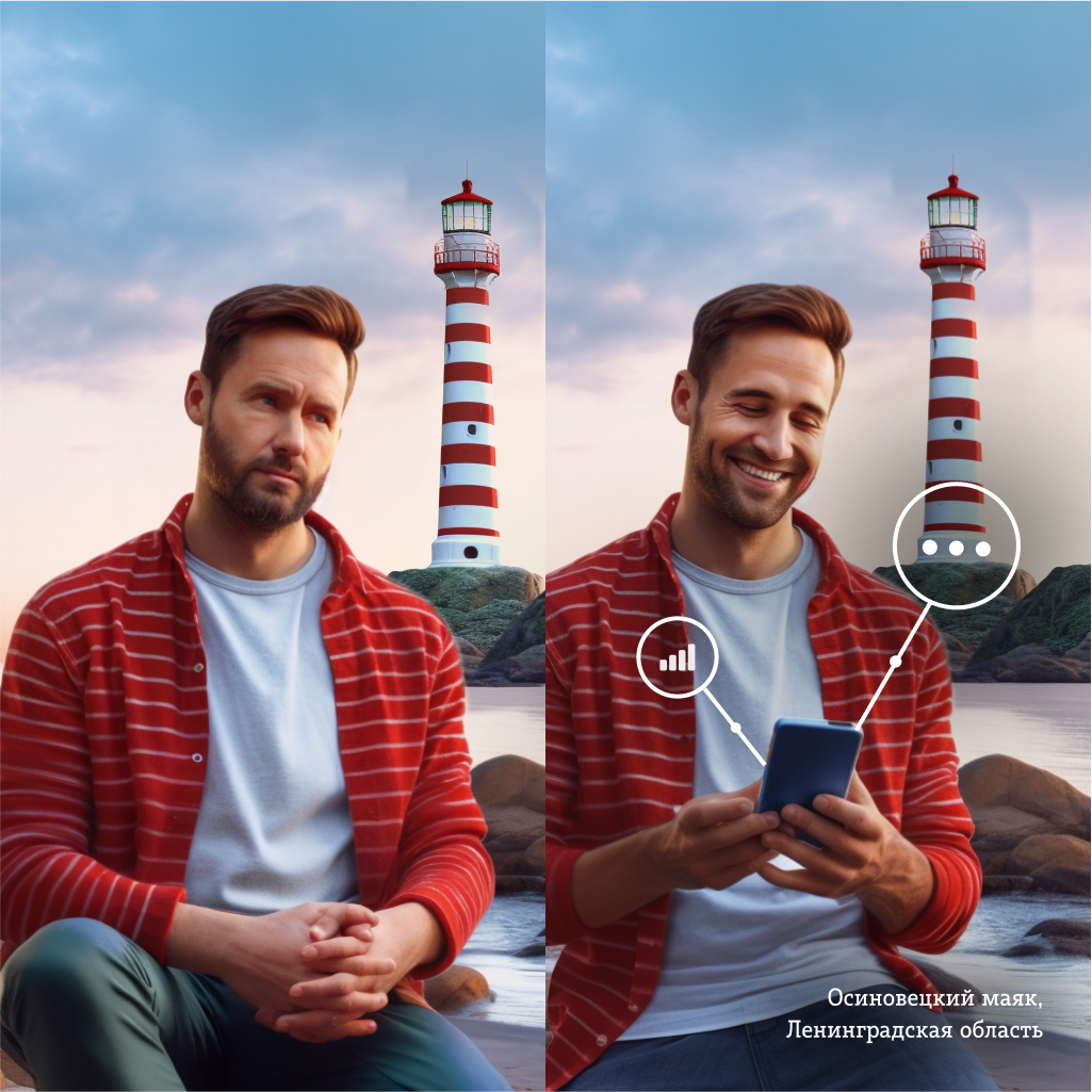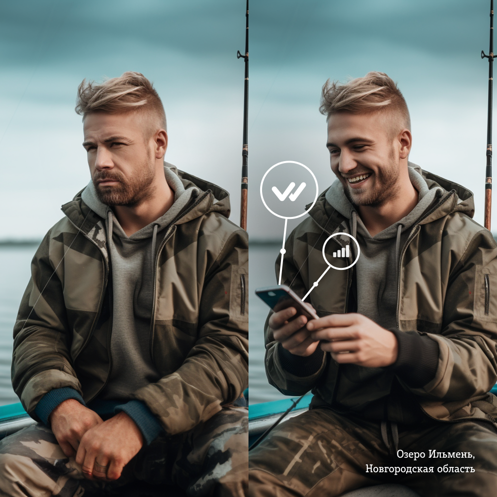 Первый клиент — оператор сотовой связи. Задача была сгенерировать две части изображения: грустного человека, у которого не ловит связь, и счастливого абонента, отправляющего сообщения.