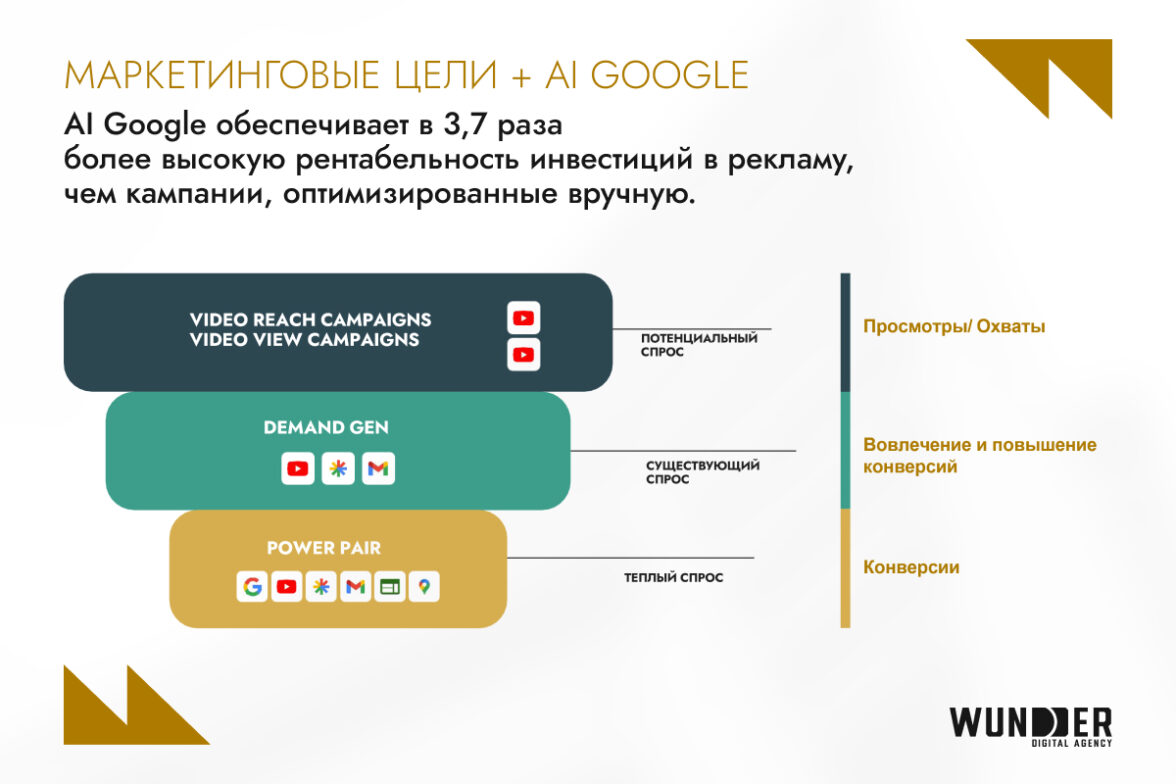 Рост влияния YouTube обусловлен не только расширением аудитории, но и активным внедрением технологий. Google развивает инструменты на базе искусственного интеллекта, которые работают сквозным образом, охватывая весь путь пользователя, от узнаваемости до конверсии.