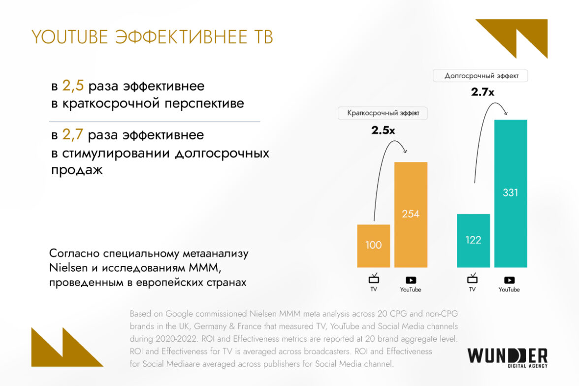 YouTube опережает другие каналы по ROI: +29% к соцсетям и +109% к традиционному ТВ. По данным Nielsen, YouTube превосходит ТВ по эффективности в 2,5 раза в краткосрочной перспективе и в 2,7 раза — в долгосрочной.