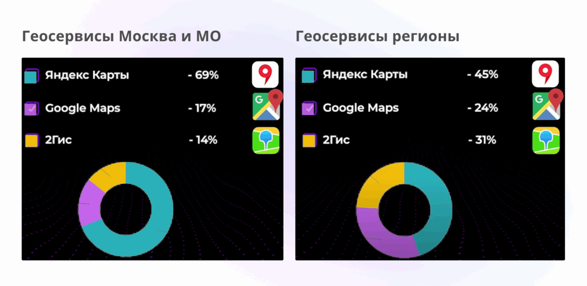 Почему именно Яндекс.Карты? Все просто: в Москве и области 69% обращений с геосервисов идут именно оттуда, в регионах — почти половина. Поэтому ключевая задача клиники — занять сильные позиции именно на этой платформе.