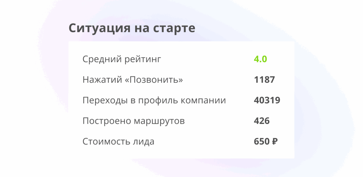 Следующим шагом стала подготовка к запуску рекламы. Мы провели детальный анализ конкурентов: изучили, кто и как продвигается на Яндекс.Картах, а также какие рекламные форматы они используют на других рейтинговых площадках.