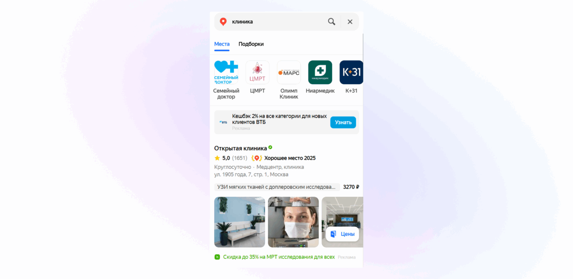 Сегодня средняя цена одного обращения в клинику через контекстную рекламу варьируется от 1000 до 10 000 рублей в зависимости от региона и направления. При этом геосервисы давно обогнали платные каналы по эффективности: в Москве и области 32% обращений в клиники приходят именно с карт против 30% из контекста. А в регионах разрыв еще больше — 38% против 17%.