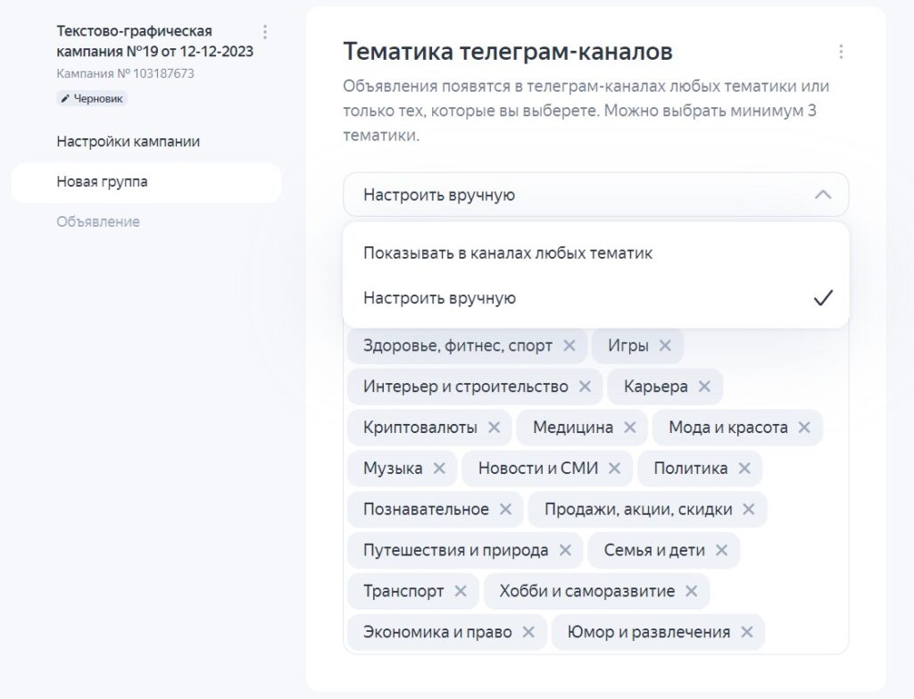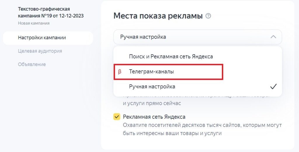 В режиме эксперта создаёте рекламную кампанию и выбираете место размещения телеграм-каналы.