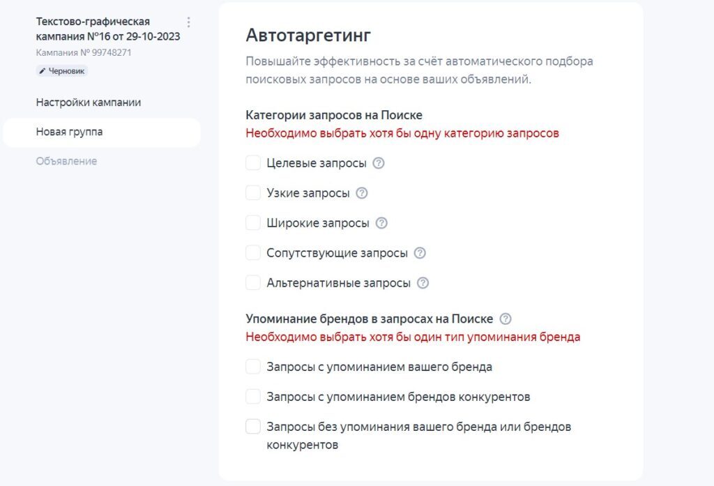 Осенью 2023 года автотаргетинг в новых поисковых кампаниях стал обязательным. Теперь при создании группы объявлений нужно выбрать хотя бы одну категорию. Без этого система не даст сохранить изменения.