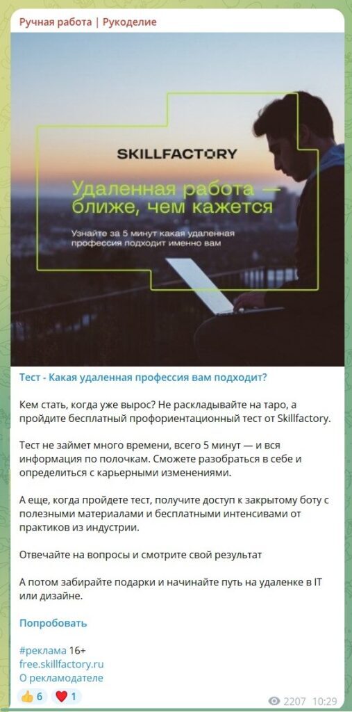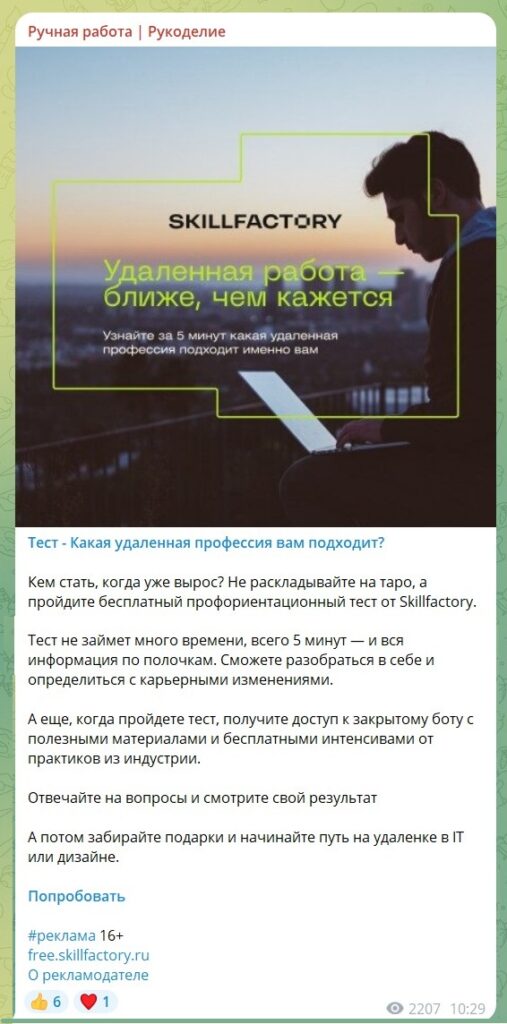 Летом было запущено тестирование нового плейсмента в РСЯ — телеграм-каналов. Вот так выглядит рекламное объявление в Telegram, настроенное в Директе: