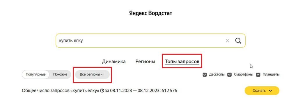 В новом интерфейсе Wordstat для выбора региона переходим на вкладку «Топы запросов» — «Все регионы».