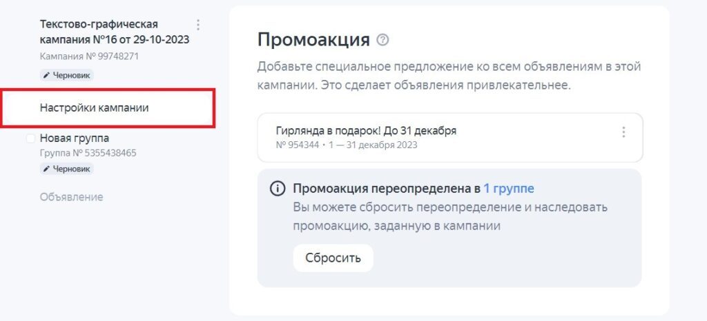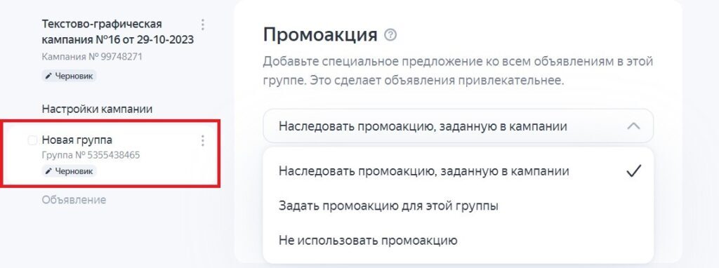 Для отключения настройки выбираете «не использовать промоакцию». Сделать это возможно не только на уровне группы, но и на уровне кампании.