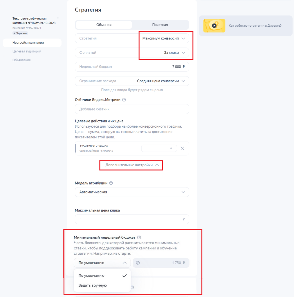 Казалось бы, зачем нужен минимальный бюджет, когда можно задать ограничение по недельному бюджету. Суть настройки в том, что мы не ограничиваем бюджет, а наоборот показываем системе сумму, меньше которой потратить нельзя. Как бы мотивируем Директ израсходовать её.