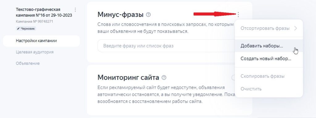 Теперь наборы минус-фраз доступны и на уровне кампаний.