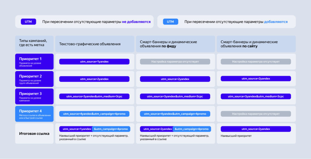 Но есть нюансы! Допустим, мы добавили разные метки на уровне кампании, группы и объявления, а также в саму ссылку. Система определяет наивысший приоритет объявления, сопоставляет параметры с теми, что в ссылке, а остальные метки (группы, кампании) игнорирует.