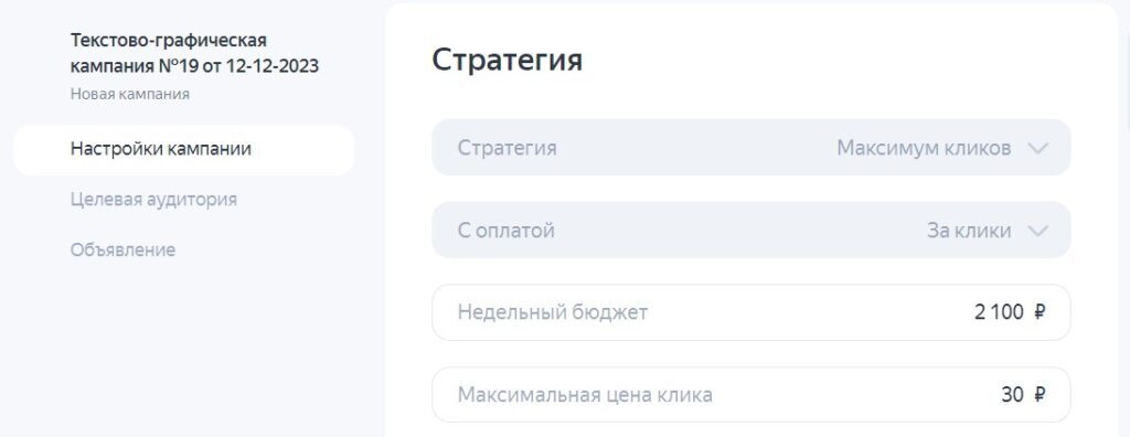 Стратегия — только «Максимум кликов» с оплатой за клик. Задаёте недельный бюджет и максимальную цену клика. Деньги будут списываться только за клики в первые 48 часов после публикации объявления в канале.