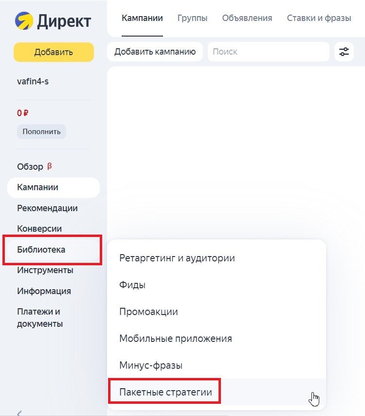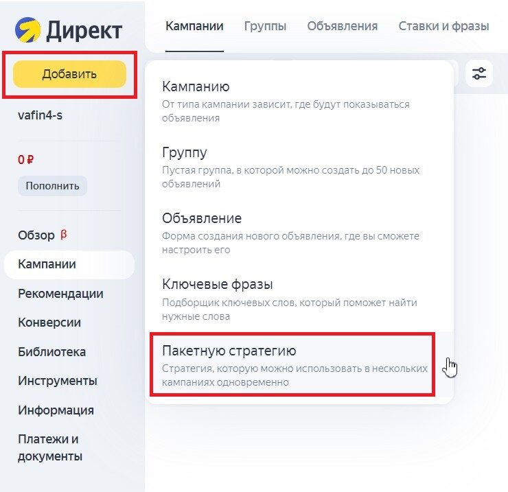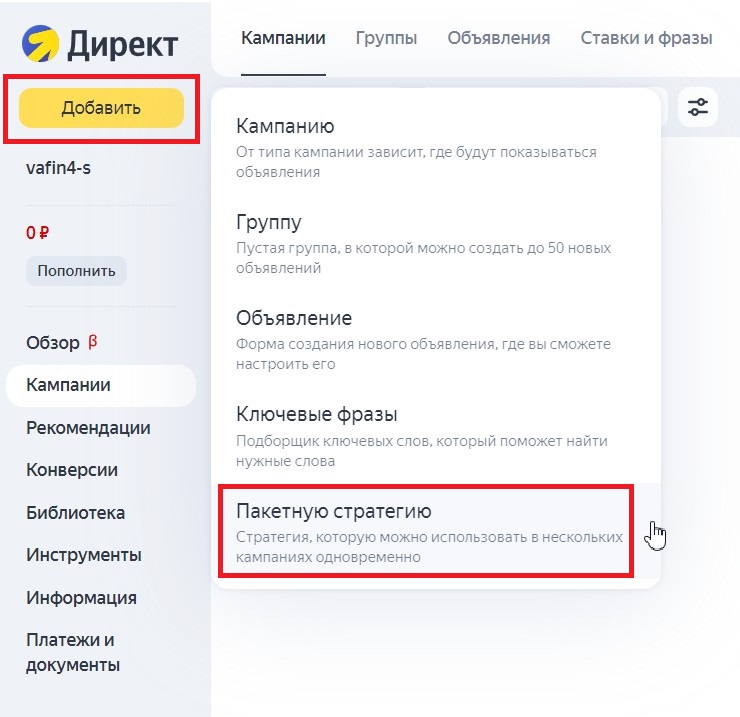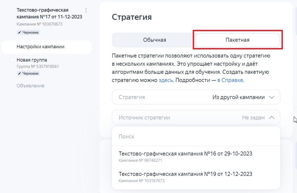 Создать пакетную стратегию можно на основе уже работающей кампании или с нуля.