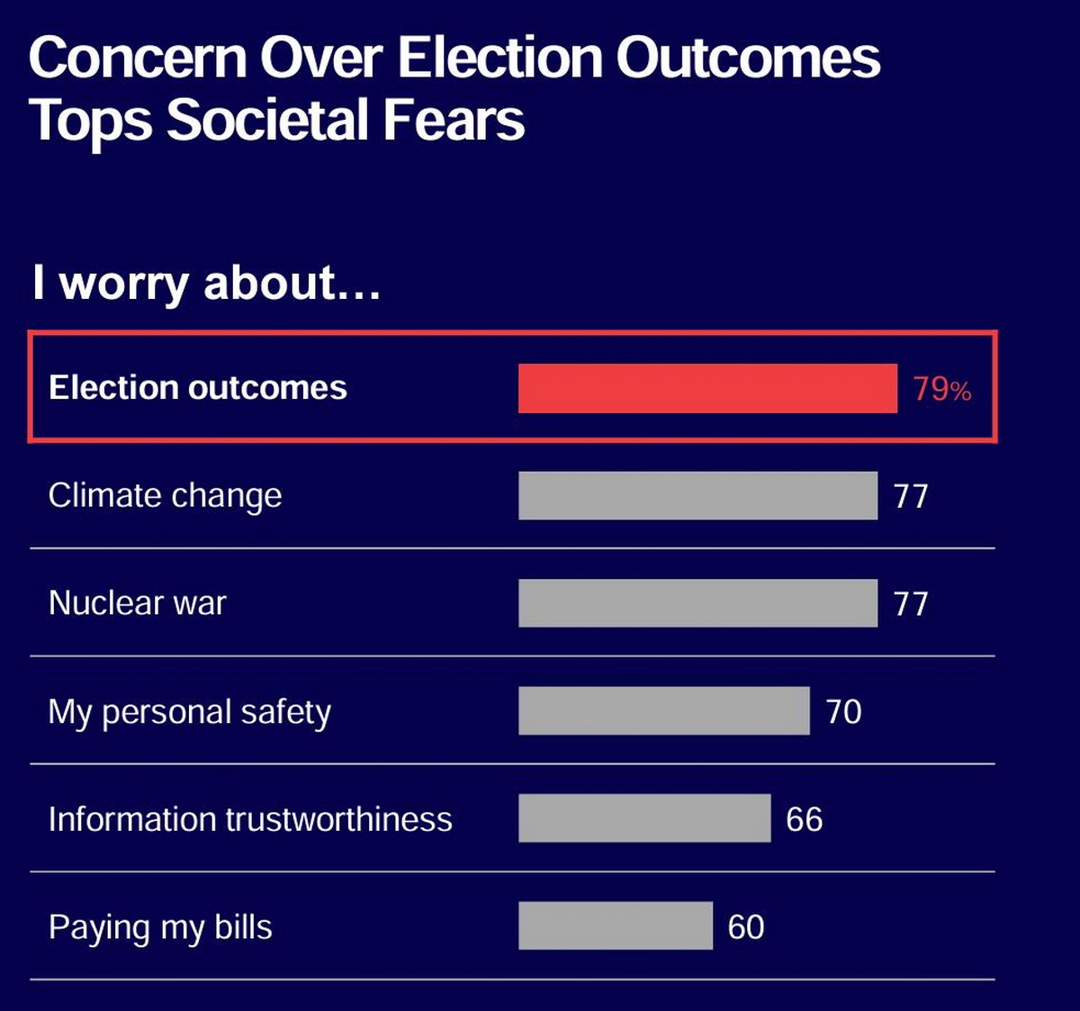 2024 год – год выборов для многих стран мира. В ходе опроса выяснилось, что результаты выборов больше всего волнуют жителей тех стран, где они проводятся. Такой ответ дали в среднем 79% опрошенных. Участников исследования меньше волнуют даже такие проблемы как изменение климата (77%), возможность ядерной войны (77%), личная безопасность (70%), возможность доверять информации (66%) и необходимость оплачивать счета (60%).