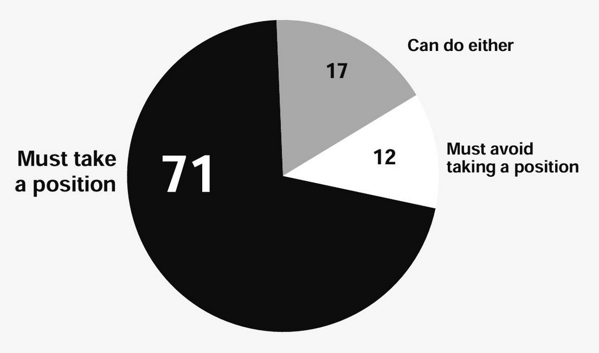 При этом потребители понимают, что бренды подвергаются политическому давлению. Большинство опрошенных – 71% – считает, что бренд обязан занимать определенную позицию по волнующим общество политическим проблемам. А если бренд не высказывается, то, по мнению незначительного большинства (51%), он ничего в этом направлении не предпринимает или даже что-то скрывает.