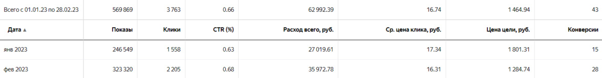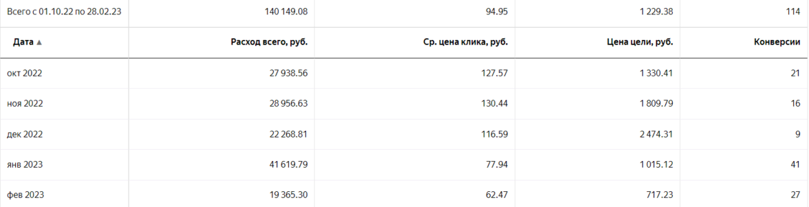 Уже в январе мы увидели, что количество лидов возросло (скриншот ниже), а их стоимость уменьшилась. В феврале результаты оказались еще лучше! Что интересно, рекламный бюджет даже не был потрачен весь ‒ Яндексу было достаточно того, что эти средства просто были на аккаунте.