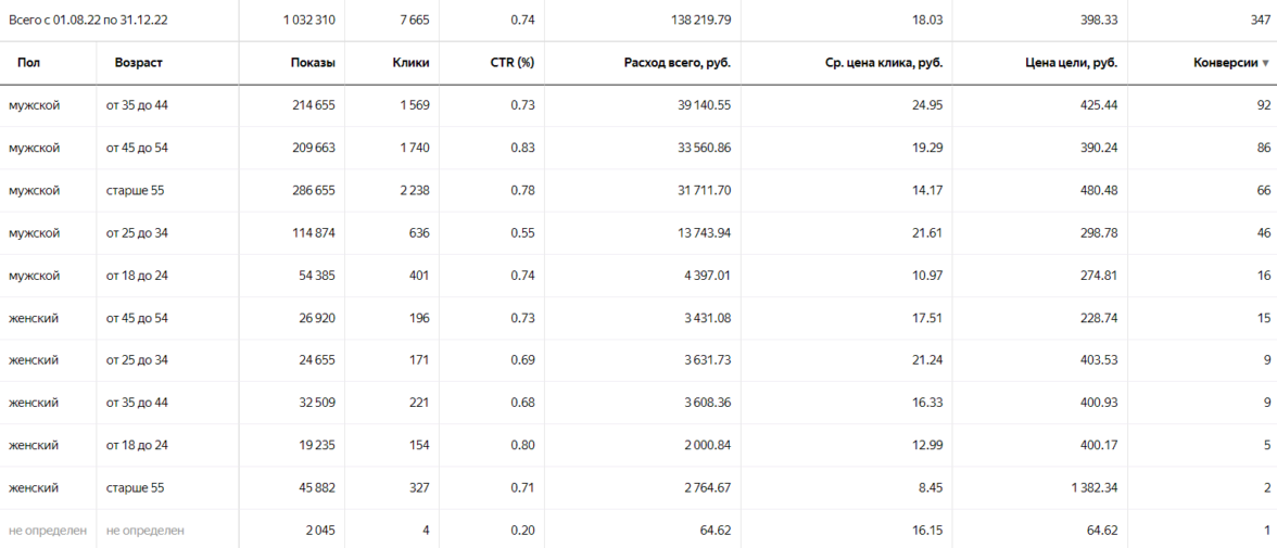Откройте Мастер отчетов и посмотрите статистику в разрезе по полу и возрасту ЦА. Там будет видно, что мужчины и женщины в возрасте младше 18 лет съедают 30% бюджета, и приносят лиды по цене в 3100 р. Женщины в возрасте старше 55 лет тратят еще 15% бюджета, а цена лида у них 2200 р.