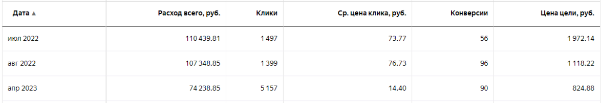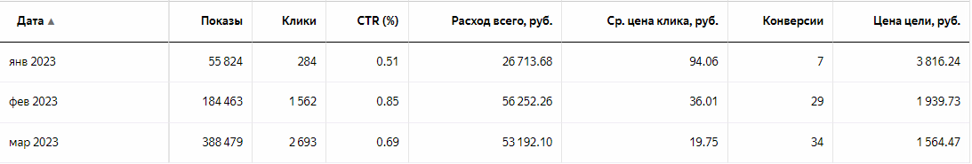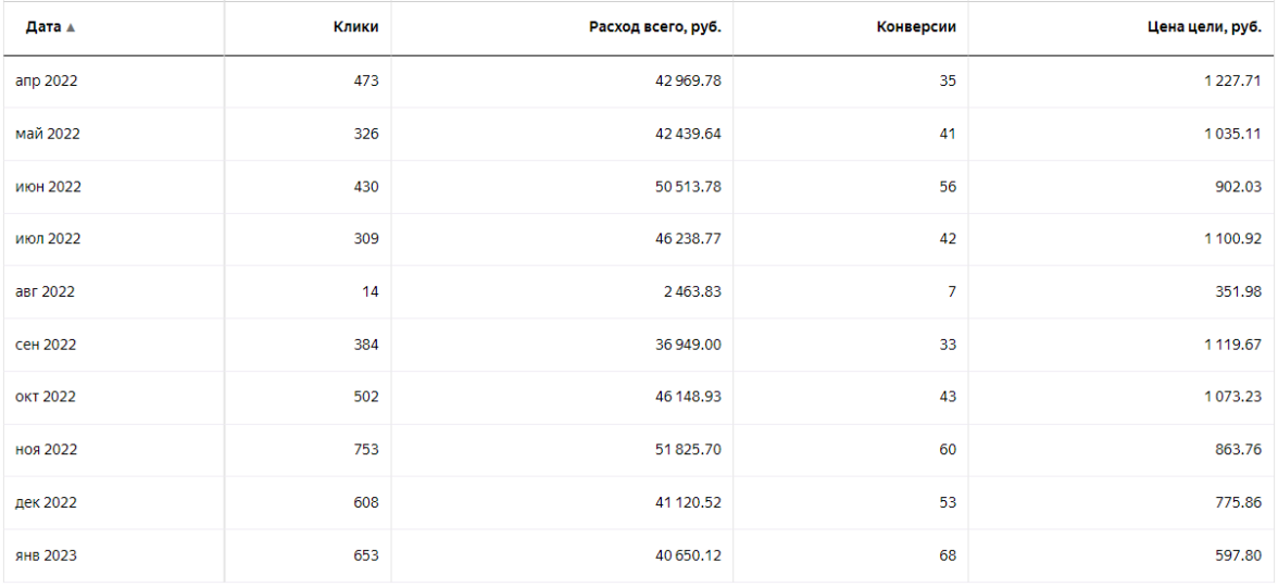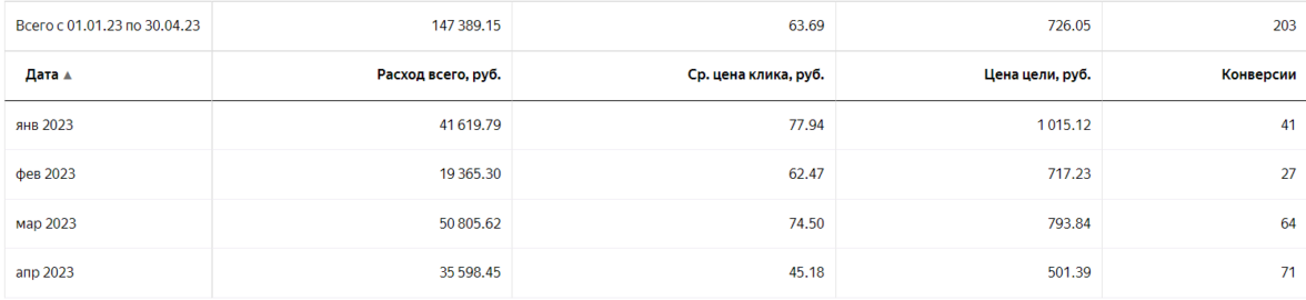 До запуска стоимость лида составляла около 1000 р. Для этой ниши ‒ нормальная цена. В январе 2023 г. мы начали добавлять МК с различными таргетингами к поисковой РК. Тогда стоимость лида начала падать. К апрелю она достигла стоимость в 500 р.