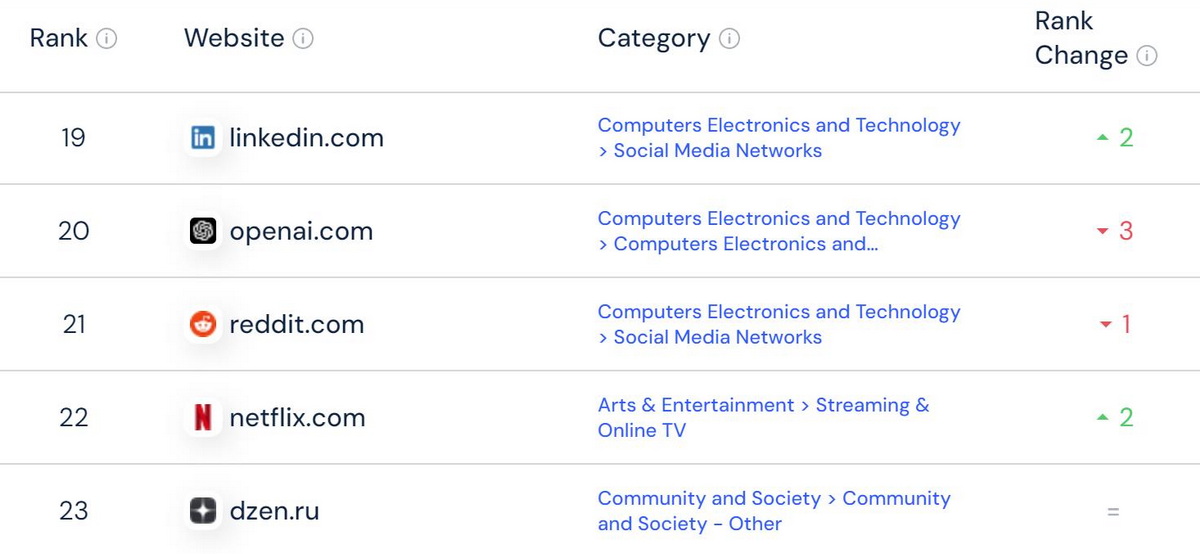 При этом, несмотря на падение интереса, сайт ChatGPT (openai.com) продолжает входит в топ-20 мировых сайтов по посещаемости с ежемесячной аудиторией 1,7 млрд человек.