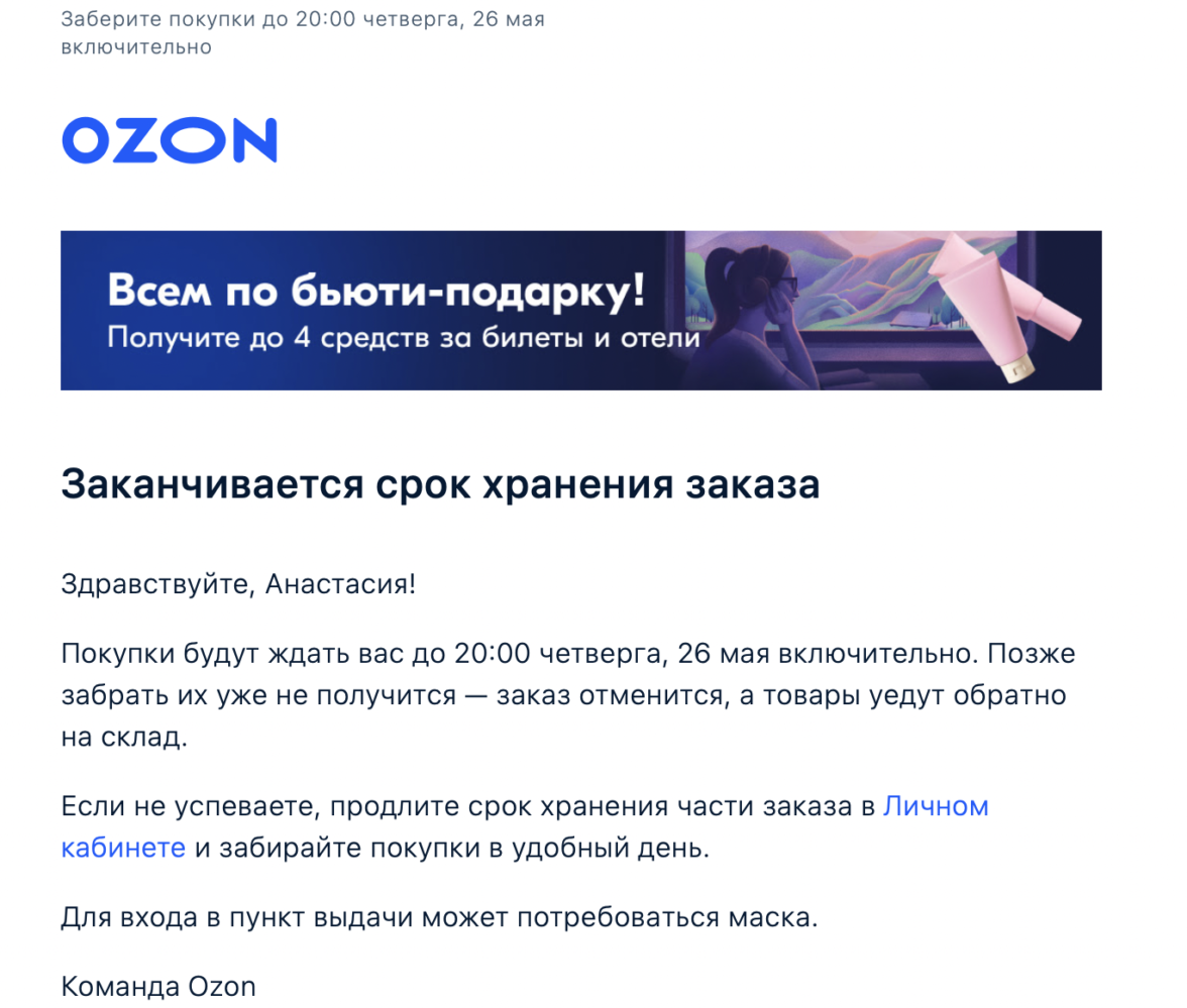 При повторных сообщениях в один и тот же канал меняйте текст, чтобы не быть похожими на спам. Например, маркетплейс в первом письме просто сообщает о доставке товара в пункт выдачи, а через два дня пишет о сроке хранения. Хотя смысл сообщения один — клиенту пора забрать заказ.
