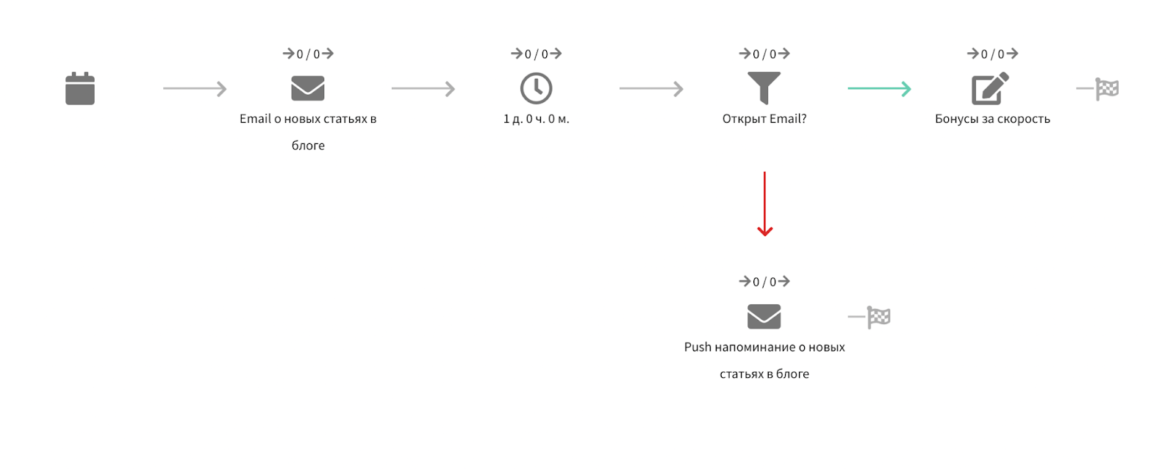 Пример. Первое сообщение приходит через Push. Если клиент не открывает его через заданное время, то рассылка продолжается через email. Если сообщение всё равно не открыто, то отправляется SMS.