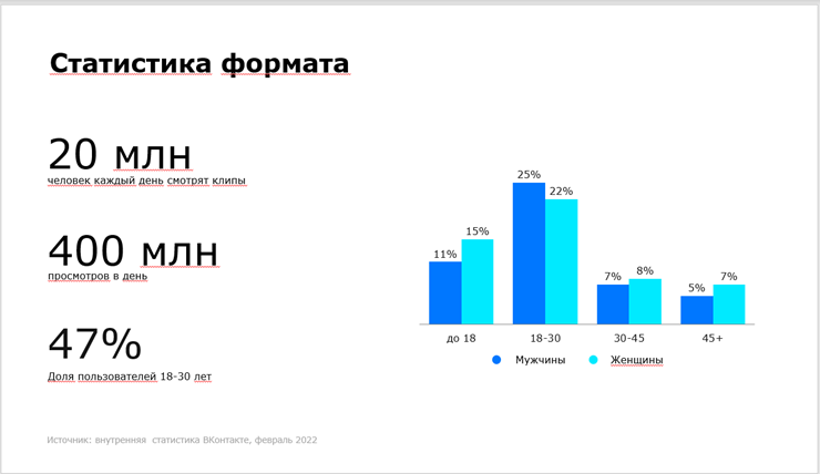 Также по просмотрам и аудитории VK Видео — видеоплатформа № 1 в России. Видеоконтент показывает резкий рост: число просмотров видео Вконтакте — на 40%, число загрузок коротких вертикальных видео в Клипах — в 2 раза. 8 марта социальная сеть достигла рекордных отметок в 1,75 млрд просмотров видео и 600 млн просмотров клипов в сутки. Клипы — это бесконечная лента коротких вертикальных видео на самые разные темы: от развлечений до образования, которые стали полноценной альтернативой тиктокам или сюжетам в YouTube.