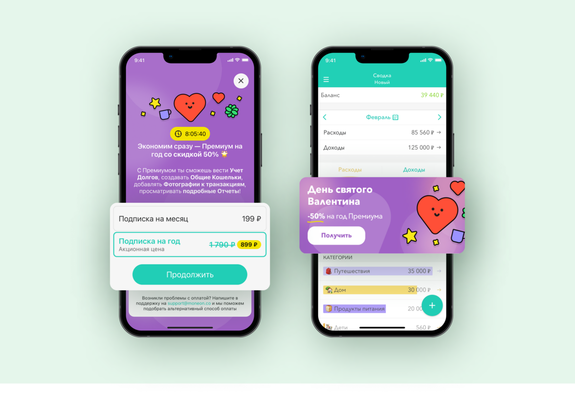 Например, в приложении для управления личными финансами Moneon базовые функции учёта финансов бесплатны навсегда, а расширенные возможности — совместные кошельки, детальная аналитика и формирование отчётов — доступны по платной подписке.