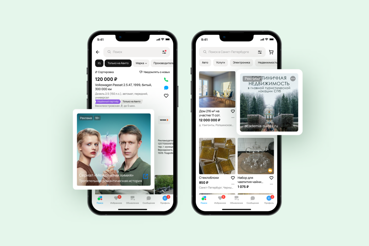 Нативная реклама — блоки, замаскированные под дизайн приложения, которые соответствуют контексту и выглядят уместно. Например, Premium App в приложении Авито — это крупноформатный медийный блок, но визуально похожий на обычные объявления.
