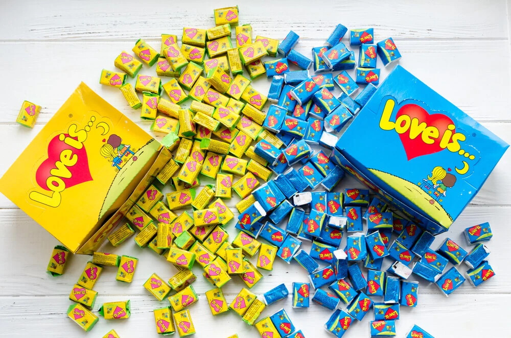 Удачный пример — запоминающееся лого жвачки Love is…Простой логотип с плавными линиями легчо читается и узнаётся даже на маленькой упаковке.