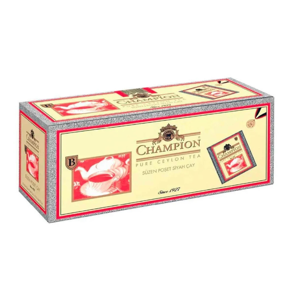 Например, чай Сhampion с комбинированным золотистым логотипом, которые не выделяется на полке среди других эконом-чаев.