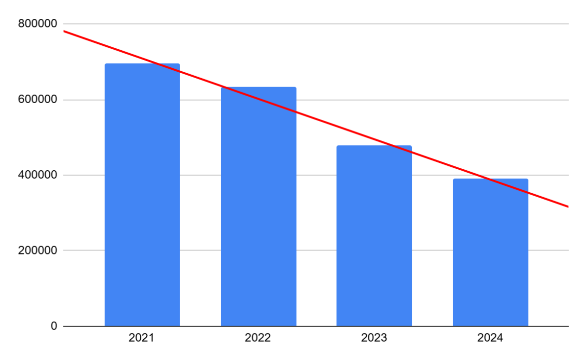 С 2022 года из-за экономической ситуации заметно снижается спрос и покупательная способность целевой аудитории. Спрос снизился в 2024 году по сравнению с 2021 в 1,8 раза.