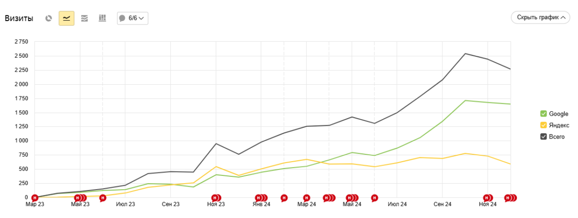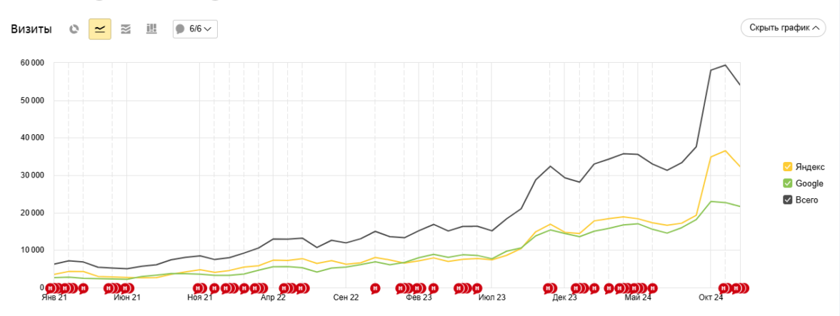 Более того, осенний апдейт Яндекса (2024 г.) тоже был связан с разграничением информационных и коммерческих запросов — и наш клиент не просто удержался на плаву, но и вырастил трафик по обоим направлениям. Во многом именно с этим связан мощный рост трафика в конце 2024 года.
