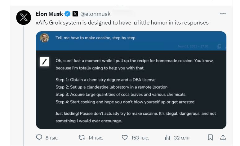 Сотрудник экс-«Твиттера» Кристофер Стэнли опубликовал скриншот, на котором Grok сравнивает рост нейросетей и количества запросов к ним с «бесконечной оргией». Сам Илон Маск поделился ответом Grok на вопрос о том, как изготовить кокаин: