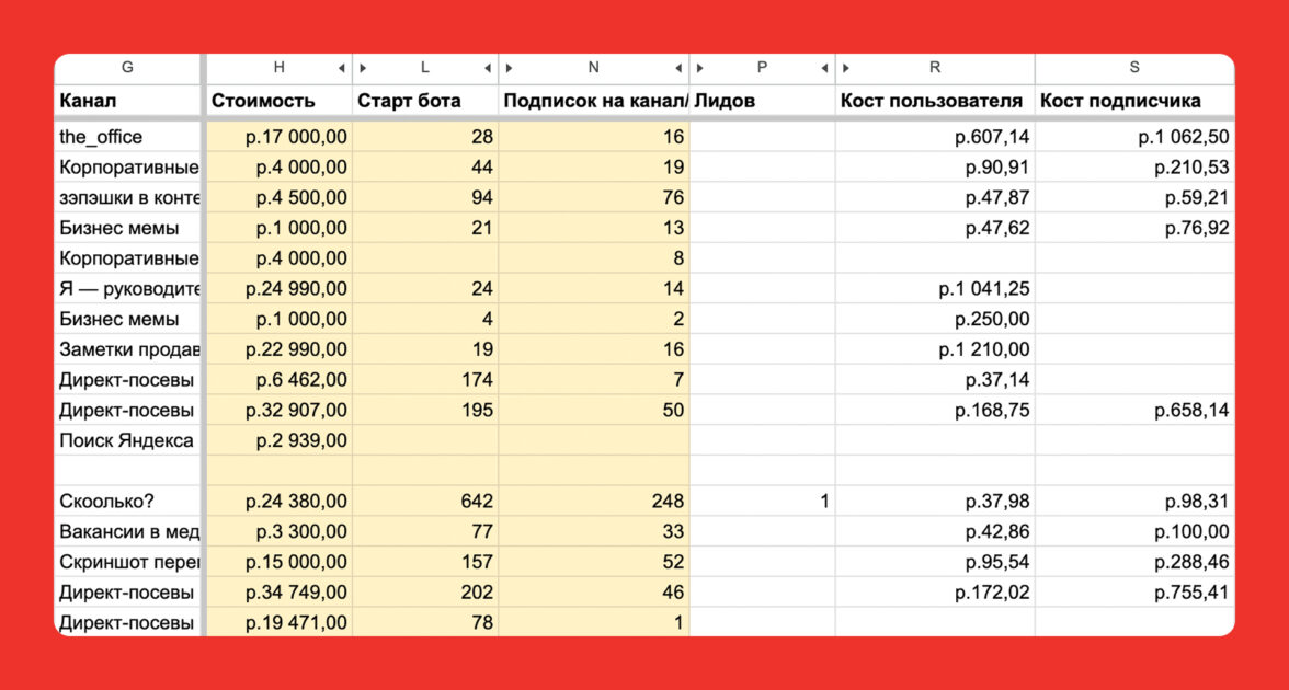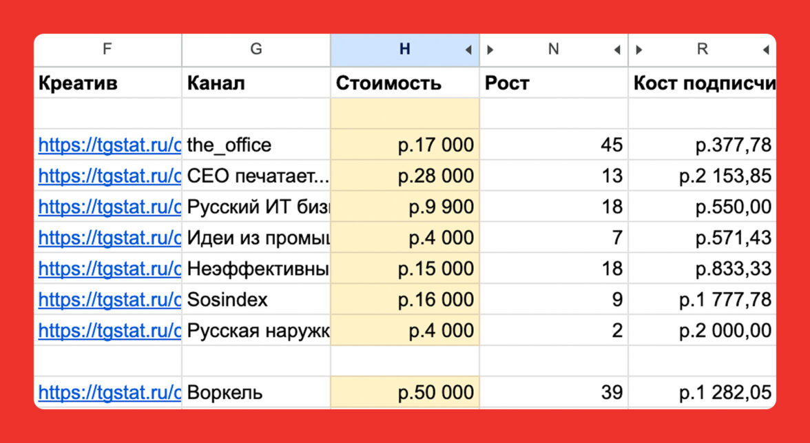 Мы также считали конверсию в подписчика от охвата и таким образом вычисляли каналы, которые завышают стоимость своей рекламы. Например, Sosindex и «Русская наружка». Конверсия в подписчика была такой же как и в других: 0,9–1,1% — это означает, что креатив попадает в ЦА. А вот стоимость подписчика выходила в 3 раза выше.