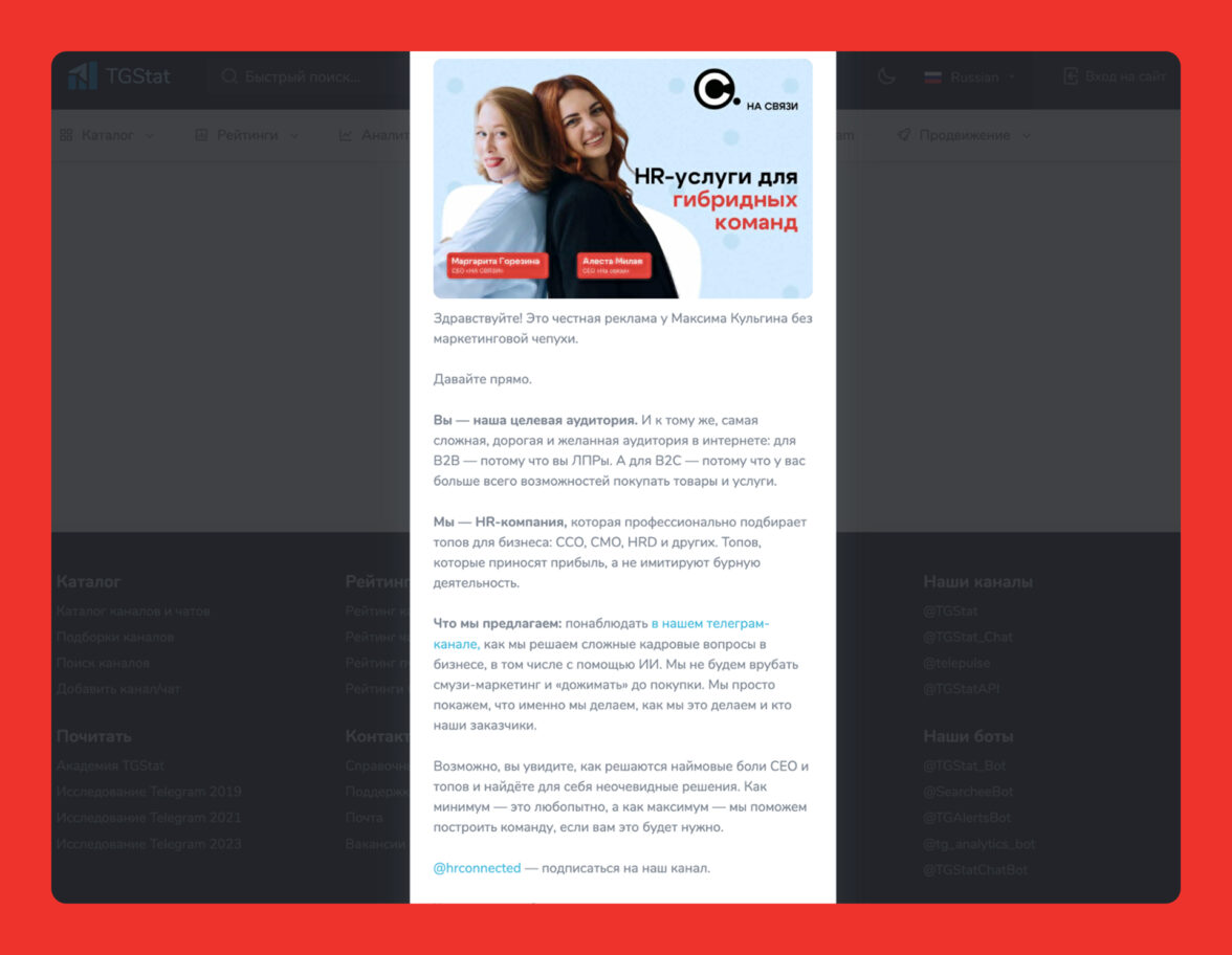 Сначала решили качать канал для предпринимателей. Раз агентство подбирает ассистентов для бизнеса, нужно искать предпринимателей и топов, ответственных за найм. Разместили прямые рекламные посевы в профильных каналах для собственников.