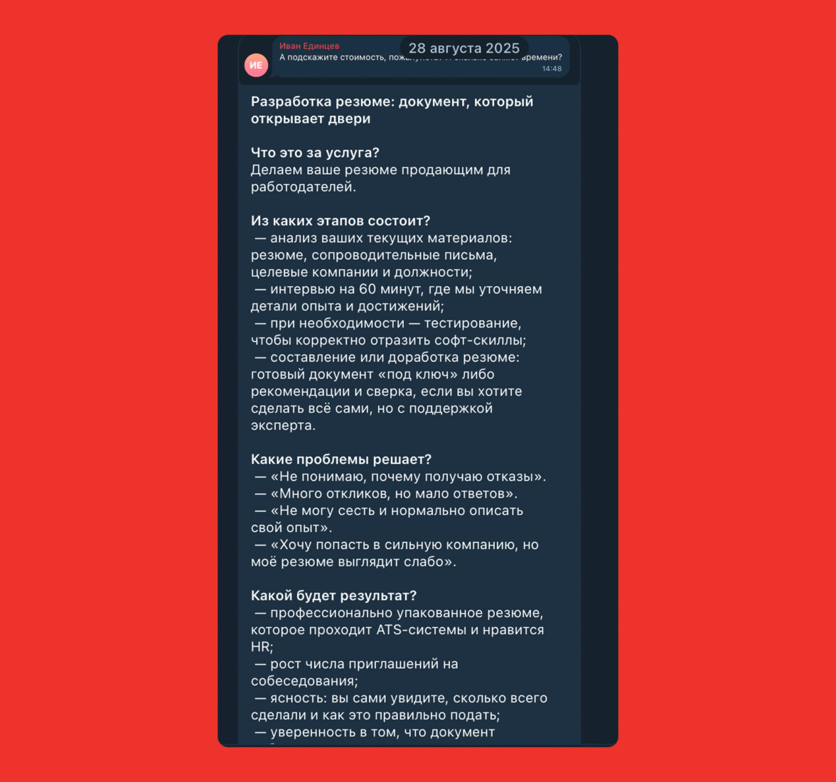 Типичные лендинги в этой нише говорят одно и то же: «Профессиональное резюме за 3 дня», «Увеличим отклики», «Опытные HR». Но почему человек, который уже месяц безуспешно рассылает резюме, должен поверить именно этому обещанию? И главное — какое обещание ему вообще нужно?