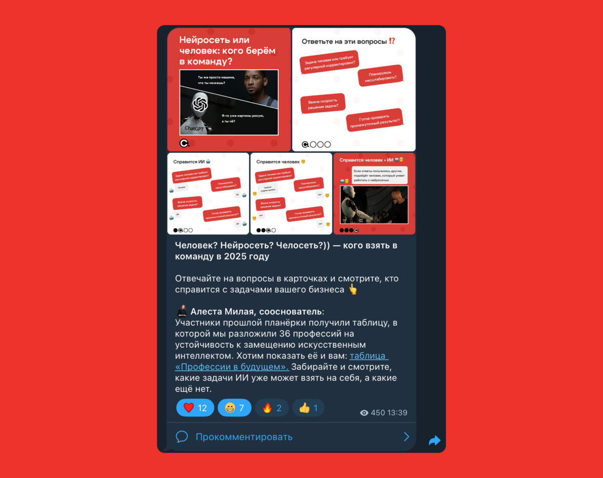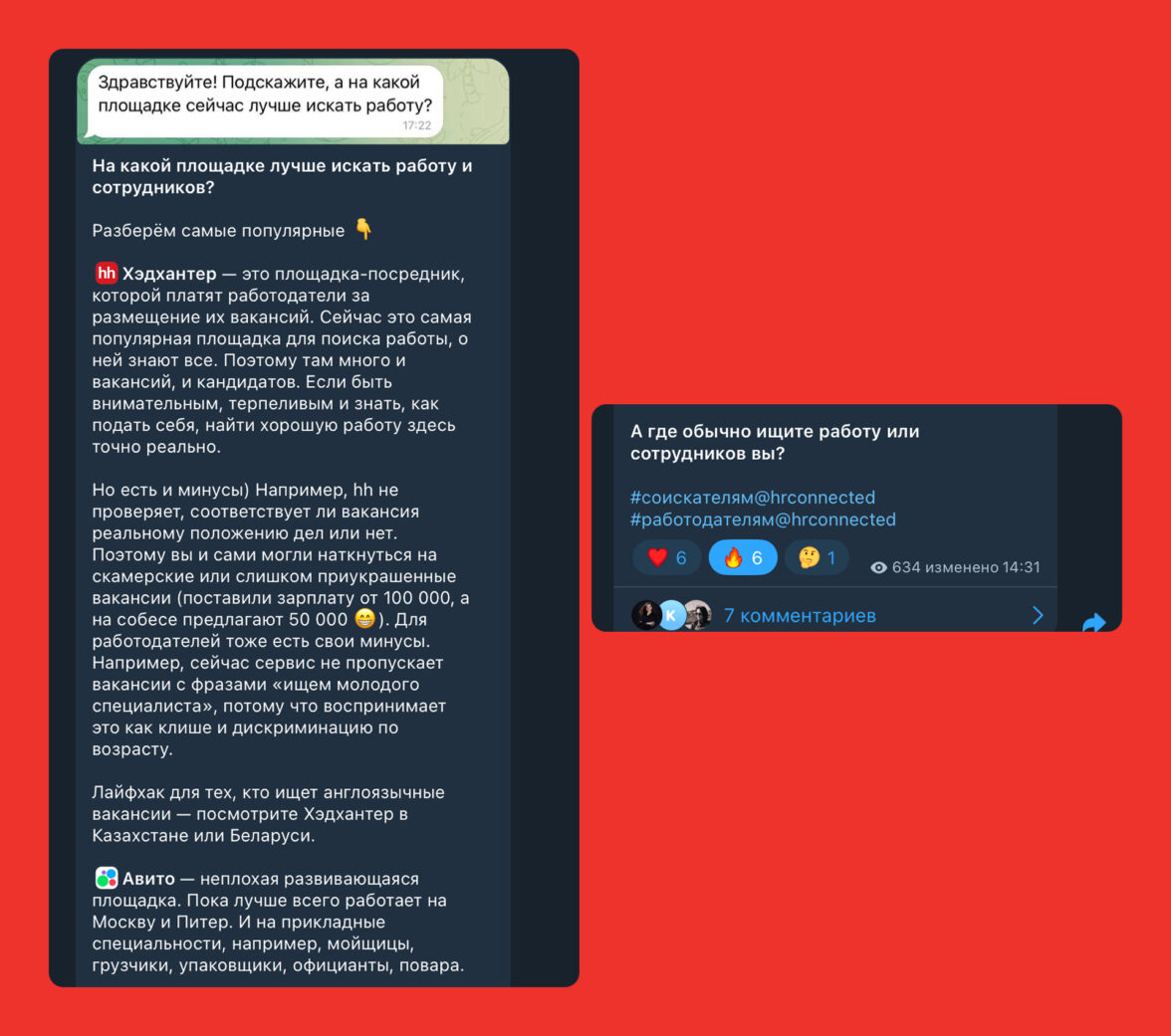 Изначально клиент очень хотел объединить в канале работодателей и соискателей — чтобы обоим было интересно. Как мы ни старались, не получилось: слишком разные боли, разный язык, разные ожидания. Мы знали, что так будет, но клиент очень просил попробовать.