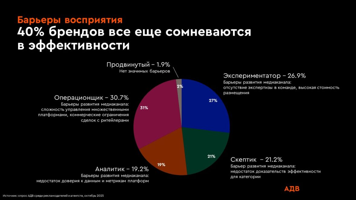 Это подтверждает ожидание качественного роста, где ключевым вызовом становится переход от масштабирования объемов к управлению результатом. Для 40% брендов основным барьером, сдерживающим развитие в ритейл-медиа, остается вопрос подтверждения эффективности. Это также сопровождается операционной сложностью и недостатком экспертизы (источник: АДВ, октябрь 2025).