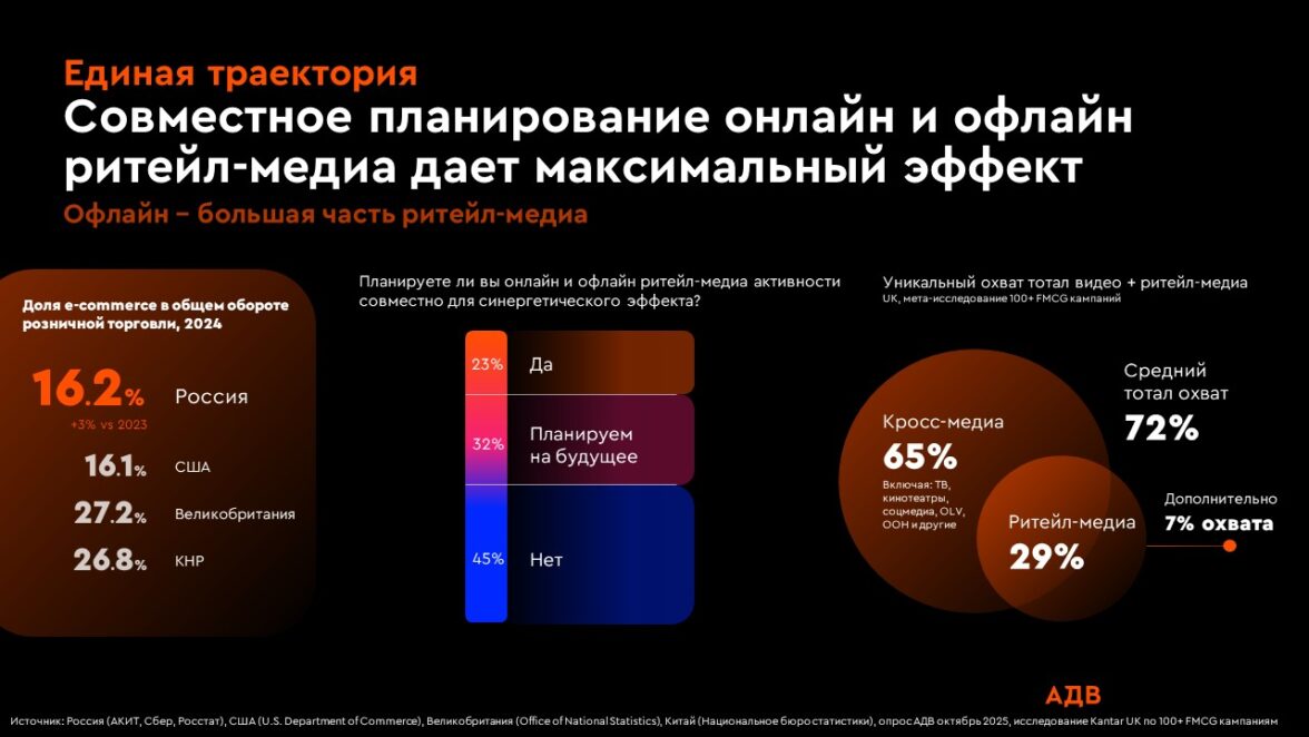 При этом офлайн остается крупнейшей частью ритейл-медиа, а доля e-commerce в общем обороте розницы в России составляет 16,2% (источник: АКИТ, Сбер, Росстат). Международные исследования показывают, что кросс-медийный подход дает дополнительный охват в среднем +7% (при среднем кросс-медиа охвате в 72%, с использованием ТВ, кинотеатров, социальных медиа, OLV, наружной рекламы, ритейл медиа) и усиливает общий эффект кампаний (источник: исследование Kantar UK).
