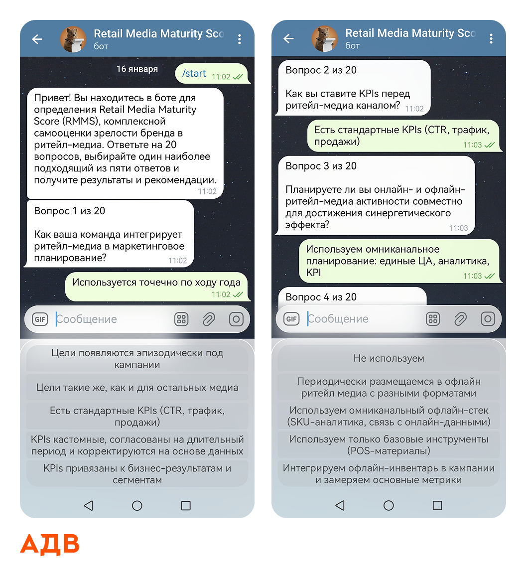 Чтобы компании могли соотнести свои текущие процессы с общими рыночными показателями, команда АДВ+Эндемика запустила специальный инструмент — Retail Media Maturity Scorecard. С его помощью можно провести комплексную самооценку зрелости собственных брендов в ритейл-медиа в формате чат-бота. Помимо этого, он позволяет оперативно определить уровень готовности внутренней инфраструктуры к масштабированию в этом канале и выявить потенциальные точки роста.