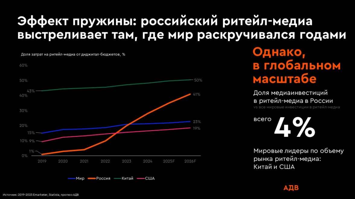 При этом в глобальном масштабе вклад России пока остается относительно небольшим. Доля инвестиций в нашей стране составляет около 4% от всех мировых вложений (источник: 2019–2025 Emarketer, Statista, прогноз АДВ). Лидерами по объему рынка остаются Китай и США, где ритейл-медиа давно стало самостоятельным и зрелым каналом в медиамиксе.