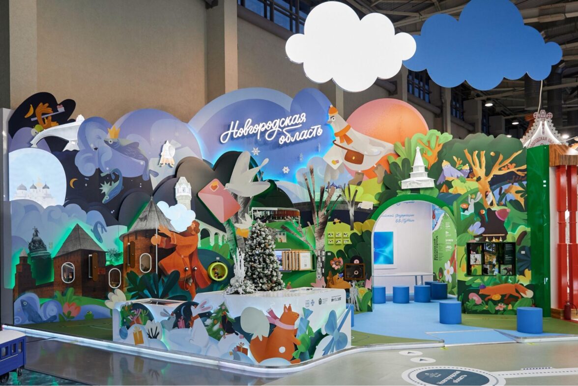 А в работе над стендом Новгородской области два раза меняли иллюстрацию: сначала на зимнюю, а потом на весенне-летнюю. Так, в зимней концепции команда переодела персонажей в теплую одежду, надела на них шарфы и шапочки.