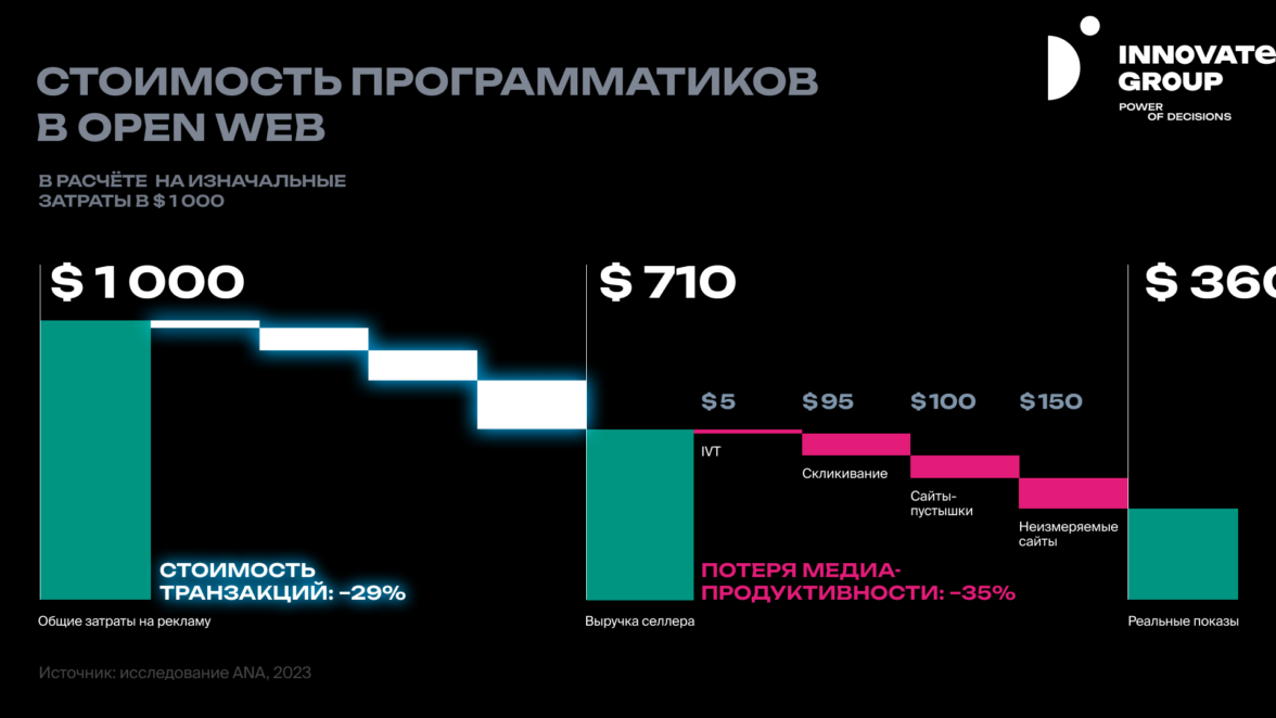 Сейчас из-за затрат на транзакции и продуктивность в системе поставок программатиков только 36 центов из каждого затраченного доллара работают на то, чтобы достичь потребителя.
