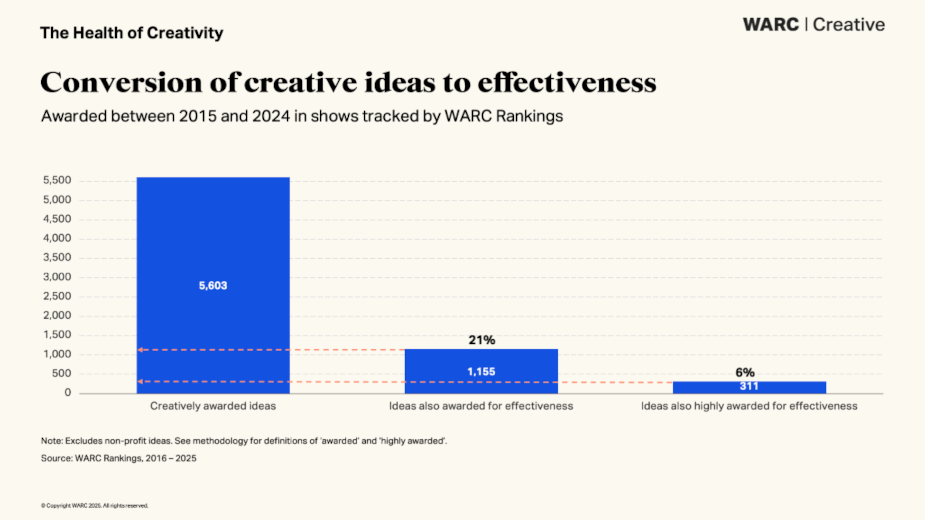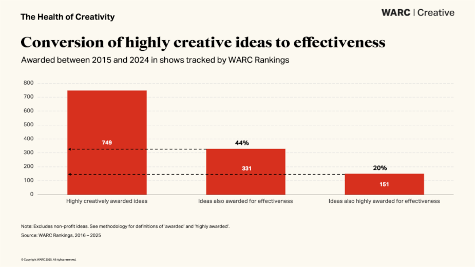 Из этих расчетов WARC делает вывод, что вместе с креативностью растет и эффективность — у суперкреативных работ конверсия в награды за эффективность удваивается с 21% до 44%.