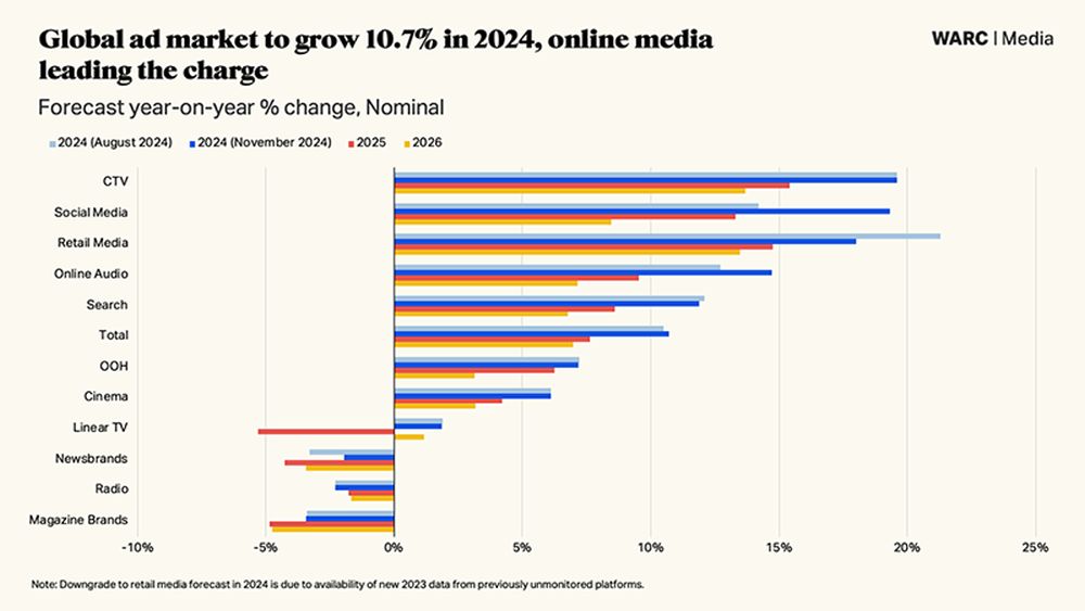 WARC: мировая реклама вырастет на 10,7% в 2024 году и на 7,6% в 2025-м, если не потеряет $33 млрд рекламных денег Google