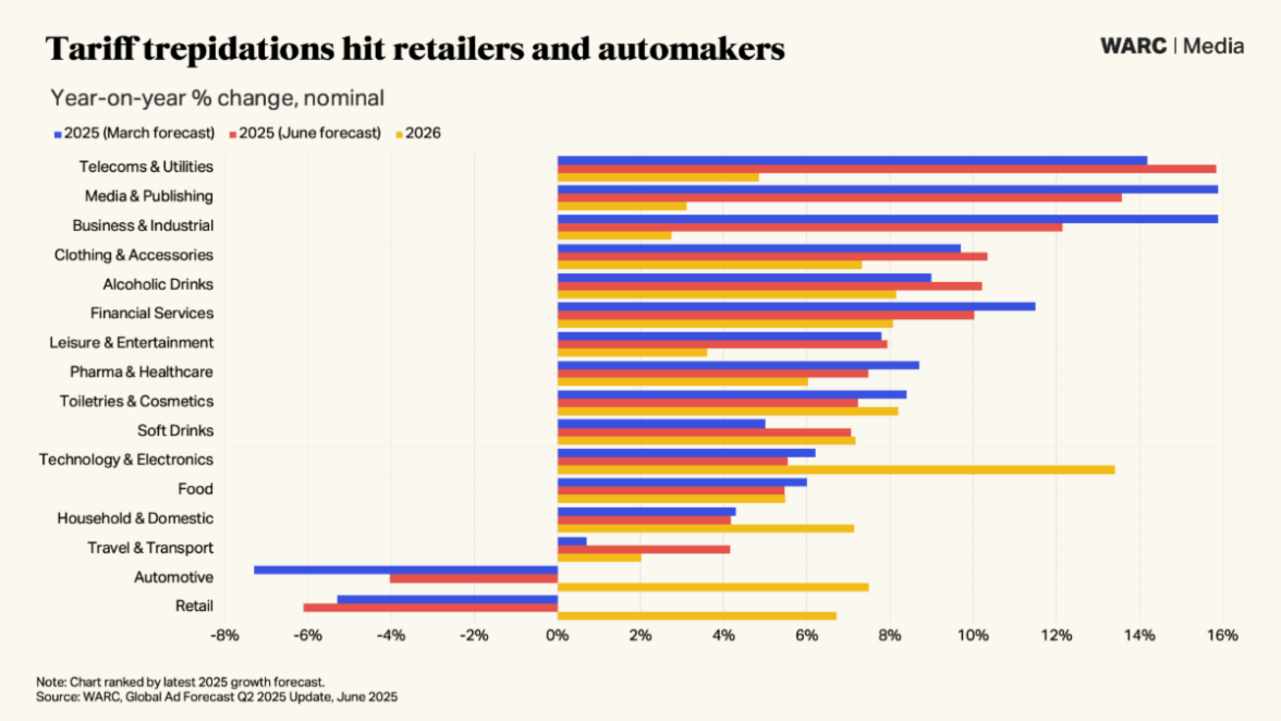 Рекламодатели из технологического сектора и производители электроники в прошлом году увеличили рекламные бюджеты на 24,3%. Но в этом году WARC ожидает снижения роста до 5,5% в годовом исчислении. В связи с повышением пошлин на китайский импорт до 145% и дополнительными пошлинами на товары из Канады и Мексики снизятся темпы роста и у производителей потребительских упакованных товаров (CPG), с 13% в 2024 году до 6,7% в этом.