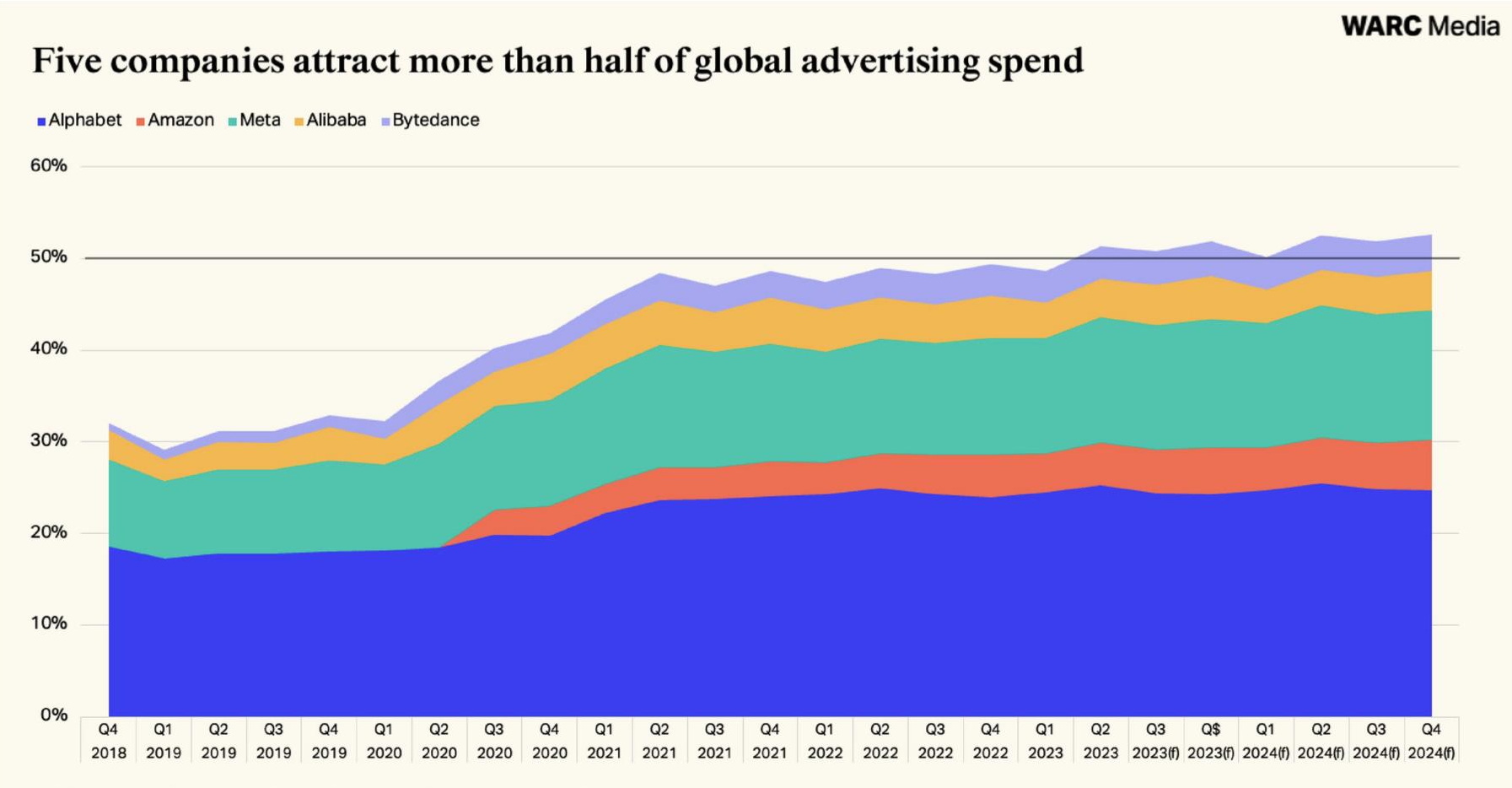 При этом аналитики отмечают, что большую часть рекламных доходов контролируют всего пять компаний: Alphabet (Google), Amazon, Meta*, Alibaba и ByteDance. К концу 2023 году на них в совокупности будет приходиться около половины (50,7%) всех мировых расходов на рекламу, а в 2024 году эта доля должна вырасти до 51,9%.